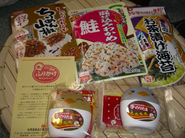 だいぶ前に丸美屋の「クイズで当たる!春のふりかけキャンペーン」に応募していて、現金50万円は外れたのですが、Wチャンス賞「のりたま50周年記念ふりかけセット」には当たった模様。