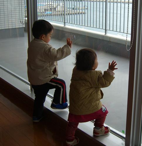 病院の談話室で見晴らしのいい景色を前に同じポーズ。。。
