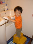 先日アカチャンホンポでちょうどよい踏み台を見つけたので、洗面台の前においていると・・・